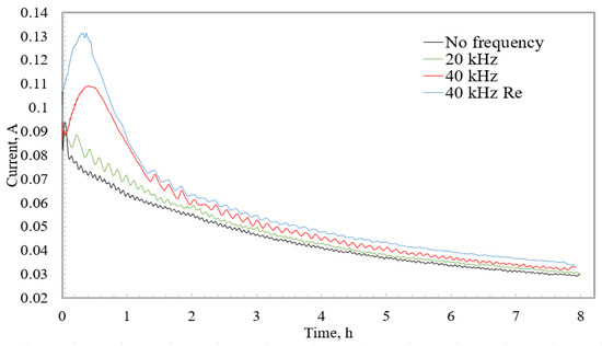 In Figure 7, the curves of the current measurement in four different fabrication regimes were presented. The first curve, when anodization was performed without the use of high-frequency excitation, can be named the standard anodization curve. First, the curve was increased, and then the curve steadily decreased, revealing a slowing process. Slight current fluctuations were caused by changing the reactor temperature in the range of 4.5–6.0 °C. Using a high-frequency excitation of 20 kHz, it was possible to conclude from the increasing current curve that the anodization reactions intensified. This could be explained by faster ion migration. At a higher frequency of 40 kHz, in the first hour of anodization, the current was increased, which could be influenced by the increased frequency and the increased oscillating amplitude. At a resonant frequency of 40 kHz, the current was even more intense. As the current started to decrease, its value approached the standard current curve (when the frequency was not used), but the current remained slightly higher throughout the process. Such a change in the current could have been influenced by the liquid barrier that formed that is reviewed in the theoretical simulations. Although the refreshing process was not as intensive as at the beginning of the anodization, the electrolyte concentration was still updated due to the high frequency.