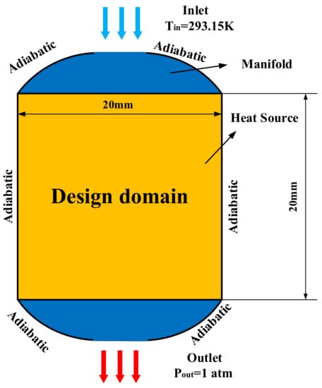 In the thermal field, as shown in Figure 2, the heat source area is a 20 × 20 mm rectangular area in which a uniform constant heat flux of 40 W/cm2 is applied. At the inlet, the temperature of the fluid provides a constant that equals 293.15 K. The outer boundary of the design domain adopts adiabatic boundary conditions.