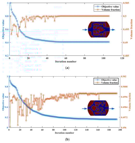 Iterative process of objective function value and volume fraction under two optimization schemes. (a) Minimum average temperature and fluid dissipated work; (b) Minimum temperature difference and fluid dissipated work.