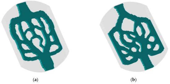 The topology optimization results for different objective functions are shown in Figure 3. Figure 3a is the 2D topological result with minimum average temperature and fluid dissipated work as optimization objectives. The fluid domain is blue, and the solid domain is red. Figure 3b is the 2D topology result with minimum temperature difference and fluid dissipated work as optimization objectives. It can be seen that the curved design domain distributes the fluid to the channel evenly and collects the fluid to the unified outlet.