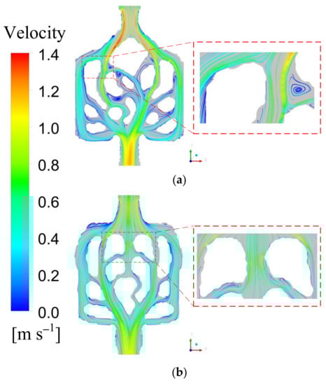 In the fluid field, the flow belongs to stable laminar flow. When the fluid flows, there is no velocity slip on the channel wall. The theory that the Reynolds number affects topological structure proposed by Yaji et al. [] is considered in the selection of velocity inlet boundary conditions. The Reynolds number can be defined as []: