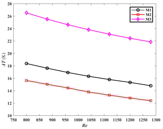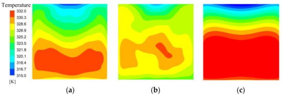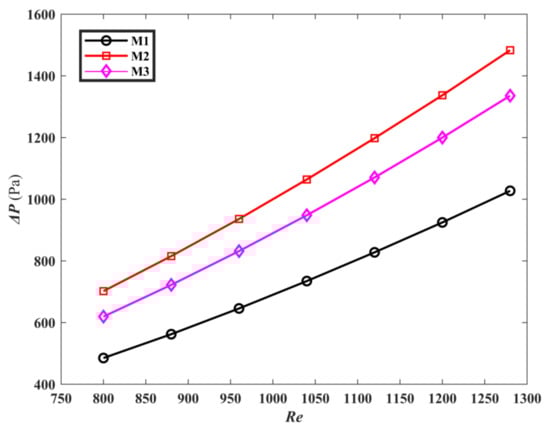 Numerical simulation needs to ensure accuracy. Three kinds of grid density, coarse, medium, and fine (4,917,623 7,046,210, and 9,092,764 elements for M1, 5,026,975 7,243,672, and 9,115,764 elements for M2, 4,028,948 6,262,361, and 8,638,427 for M3) are set, respectively. Under the same boundary conditions, the grid sensitivity tests are carried out for M1, M2, and M3, and Table 5 is the verification results. Compared with the average temperature and pressure drop under the medium density grids, the relative errors of the coarse density grids and the fine density grids of the three models are within the acceptable range, which are no more than 0.6% and 1.5%, respectively. Therefore, considering the accuracy required of simulation and the time-consuming of calculation, this paper uses the medium density grids to complete the numerical simulation.