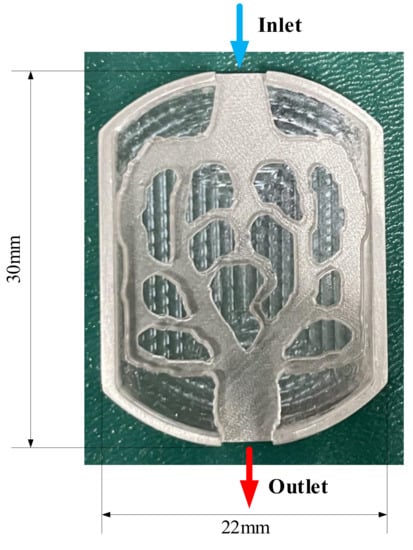 The topology optimization method is an effective method for the heat sink design, which obtains the channel structure corresponding to the optimal performance by changing the material layout in the design domain. This method breaks through the design defects of the traditional heat sink, adaptively arranges the heat sink structure, and greatly improves the heat exchange capacity. In 1988, Bendsøe and Kikuchi [] firstly proposed topology optimization technology and obtained the optimal configuration. For the first time, Borrvall and Peterson [] established an optimal model with the minimum power consumption as the optimal goal to get the best channels. Dede et al. [] used COMSOL and MATLAB commercial software to study the topology optimization of fluid flow and heat transfer. Zhang et al. [] obtained a 2D nanofluid mini-channel heat sink (NMHS) by density-based topology optimization method. Joo et al. [] obtained the optimal design of mini-channel heat sink under natural convection conditions by topology optimization. Han et al. [] used topology optimization method to complete the design of cobweb design domain. They showed that, compared with the traditional cobweb structure, the temperature difference of the topological channel was reduced by 57.32%. Qiu et al. [] realized the topology optimization design and found that, compared with the straight channel, the velocity distribution uniformity of the optimized heat sink is increased by 61.1%. Zhou et al. [] proposed a topology optimization design with the three inlets and one outlet design domain. Their results showed that the temperature difference of the optimized radiator is reduced by 62.5% compared to the straight channel heat sink. However, most of the performance of the mini-channels obtained topology optimization are studied by simulation and theoretical implementation, which are rarely verified by experiments.