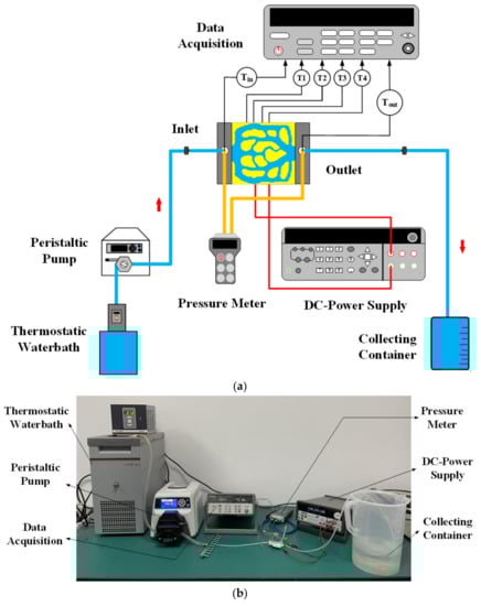 - Li, H.; Ding, X.; Jing, D.; Xiong, M.; Meng, F. Experimental and numerical investigation of liquid-cooled heat sinks designed by topology optimization. Int. J. Therm. Sci. 2019, 146, 106065. [Google Scholar] [CrossRef]