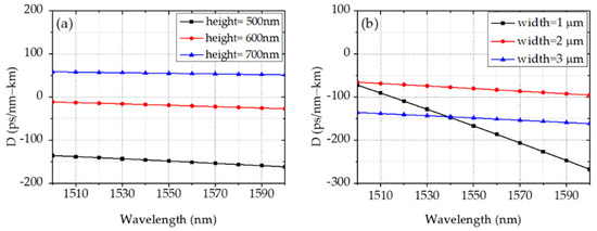 We first geometrically simulate the waveguide dispersion of the fundamental transverse electric (TE) mode for a silicon nitride waveguide based on the finite element method (FEM) at 1550 nm [20]. The numerical results are shown in Figure 1a by varying heights from 500 nm to 700 nm with a fixed width of 3 μm and in Figure 1b by varying widths from 1 μm to 3 μm with a fixed height of 500 nm. We can see that GVD moves from normal to anomalous by increasing the waveguide height above 700 nm, in agreement with the previous literature [6]. A smoother curve with less wavelength-dependency can be obtained by increasing the waveguide width from 1 μm to 3 μm.
