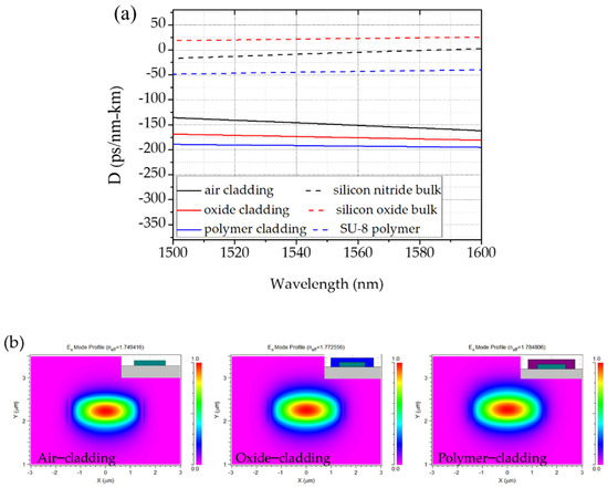(a) Waveguide dispersion of air-, oxide-, and SU-8 polymer-cladding with 500 nm height and 3 μm width (solid lines) and material dispersion of silicon nitride, silicon oxide, and SU-8 polymer (dashed lines). (b) Field distribution of the waveguide without cladding layer, with oxide-cladding layer, and with polymer-cladding layer.