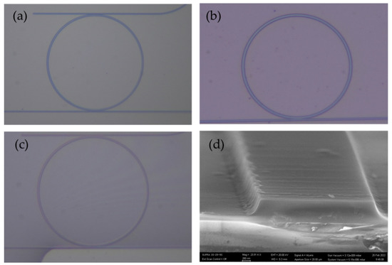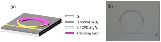 In fabrication, a 4 μm thick silicon oxide (SiO2) layer was thermally grown on silicon wafers in a diffusion furnace (Semiconductor Wafer, Inc., Hsinchu, Taiwan). Next, a 500 nm Si3N4 film was deposited with low-pressure chemical vapor deposition (LPCVD). After Si3N4 deposition, e-beam lithography (EBL, ELIONIX, Tokyo, Japan) is used to pattern the waveguide resonators with ma-N 2405, a negative-tone resist. The devices were then dry-etched in a high-density plasma etching tool (Unaxis/Nextral 860L, Grenoble, France). For the oxide-cladded device, a 1 μm SiO2 layer was deposited upon the Si3N4 resonators with plasma-enhanced chemical vapor deposition (SAMCO PD-220N, SAMCO, Kyoto, Japan) and annealed at 1050 °C for 10 h to improve the quality factor of the resonators. As for the polymer-cladded device, SU-8 GM1040 (Gersteltec, Pully, Switzerland) was spin-coated on the air-cladded microresonator with 135 °C baking for two hours. The fabricated devices are shown in Figure 5.