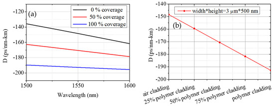 (a) Dispersion with 0 %, 50%, and 100 % coverage of polymer-cladding on the microresonator with 500 nm height and 3 μm width. (b) The corresponding dispersion dependency on the cladding coverage at 1550 nm.