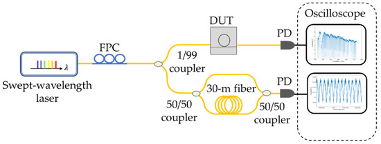Figure 6 shows the experimental setup for characterizing waveguide dispersion. A C-band, tunable laser (SANTEC TSL-550, Santec Corporation, Aichi, Japan) is used for transmission measurement. The power in the waveguide is kept below 0 dBm to avoid unwanted thermo-optical effect for the fabricated resonators. At the DUT side, a pair of lensed fibers were used to couple light into and out of the integrated Si3N4 waveguides. We measured the waveguide-TE mode in which the electric field was polarized parallel to the waveguide. Then, 1% power from the laser was split to a fiber-based interferometry system with a 30 m optical path difference. The generated interference fringes showed a periodicity around 6.89 MHz, exceeding the available frequency resolution from the tunable laser system. These reference markers not only calibrate the frequency instability from the swept-wavelength laser [23] but also extract Q factors, especially from ultra-high-Q devices [24].