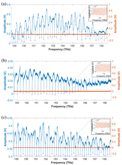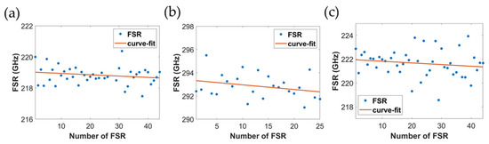 As we shown in Figure 8a–c. For the air-cladded device, the radius of the microresonator is 100 μm, and the fitted FSR difference is 7.31 MHz/FSR, while for the oxide-cladded device, the radius of the microresonator is 75 μm with the measured FSR difference of 15.7 MHz/FSR. As for the polymer-cladded device, 1 μm SU-8 polymer layer was coated on the originally air-cladded device, showing the fitted FSR difference of 14.7 MHz/FSR. The slight difference in the averaged FSRs was due to the difference in group index ng between air-cladded (ng ≈ 2.0716) and polymer-cladded devices (ng ≈ 2.0378).