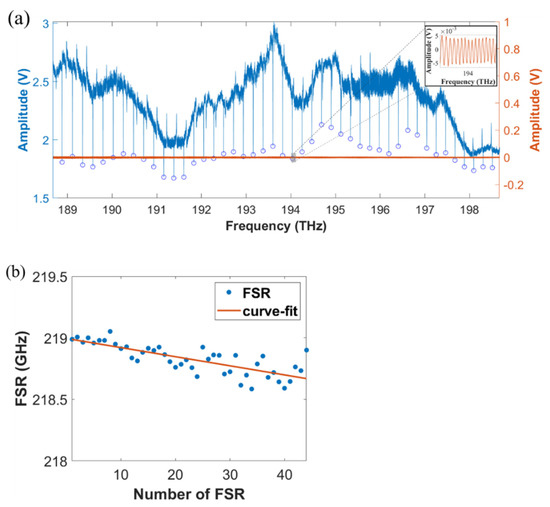 (a) Transmission spectrum of the microresonator (blue line) with cladded layer stripping. The corresponding interference fringes from the interferometer system (orange line). The zoom-in spectrum of the interference fringes is shown in the inset. (b) Distribution of FSRs.