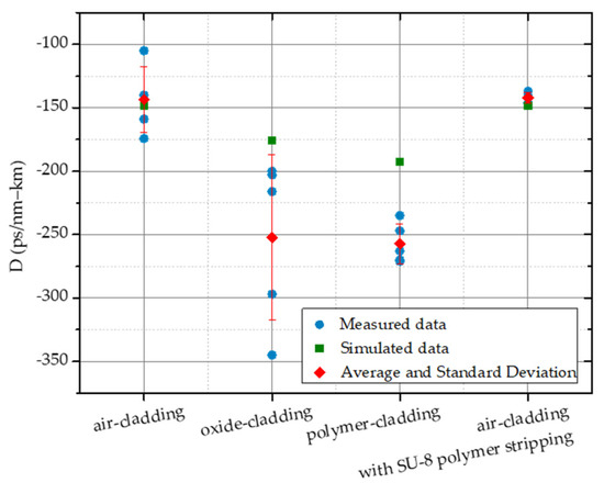 We show the comparison of the measured dispersion of air-, oxide-, SU-8 polymer-cladded, and air-cladded resonators with polymer stripping in Figure 10. The measured data were in qualitative agreement with the simulated data. For the air-cladded device, the measured dispersion parameter was −143 ± 26 ps/nm-km with the simulated value −148 ps/nm-km. In contrast, the measured dispersion parameter for the SU-8 polymer-cladded device was −257 ± 16 ps/nm-km with the simulated value −192 ps/nm-km. Higher-order terms are ignored here. The polymer-cladding effectively pushes the dispersion deeply into the normal regime, as observed in the simulation. As mentioned, the dispersion can be further engineered by designing a proper coverage layout to target the desired dispersion between air- and polymer-cladding. For the oxide-cladded device, normal dispersion −252 ± 65 ps/nm-km can be achieved with the simulated value −176 ps/nm-km. The larger variation may have come from the relatively smaller radius and, therefore larger FSR. For the device with polymer stripping, the measured dispersion parameter is −142 ± 4 ps/nm-km, which is close to that of the originally air-cladded device.