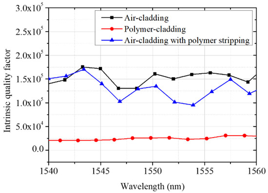 The distribution of the intrinsic quality factor for air-cladded, SU-8 polymer-cladded, and air-cladded resonators with polymer stripping.
