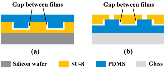 During the two molding processes, the width and depth of the chamber had some errors according to the shrinkage due to SU-8 and PDMS (see Figure 3). The dimension changed during two molding processes, as shown in Table 1. The results show that the width and depth of the chamber of mold #1 were 71.12 µm and 15.31 µm, respectively, and the corresponding error percentages were 1.60% and 2.07%, respectively. For mold #1, such error between mold #1 size and target value is within accepted error determined by the exposure accuracy and measurement precision. In addition, the results show that the width and depth of the chamber of mold #2 were 70.15 µm and 15.11 µm, respectively, and the corresponding error percentages were 0.21% and 0.73%, respectively. Compared to mold #1, mold #2 had a smaller width and depth due to PDMS shrinkage during curing. Additionally, the results show that the width and depth of the chamber of SU-8 chamber film were 70.90 µm and 14.89 µm, respectively, and the corresponding error percentages were 1.29% and 0.73%, respectively. Compared with mold #2, the increase in width and decrease in depth of the SU-8 chamber film was caused by the thermal shrinkage of SU-8 upon cooling or polymerization [32,33].