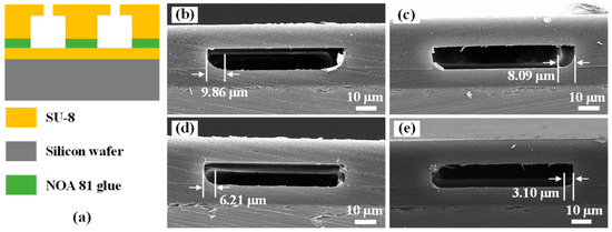 (a) The schematic diagram of cross-sections of test samples; SEM images of cross-sections of test samples exposed at various exposure doses: (b) 260 mJ/cm2; (c) 280 mJ/cm2; (d) 300 mJ/cm2; and (e) 320 mJ/cm2.