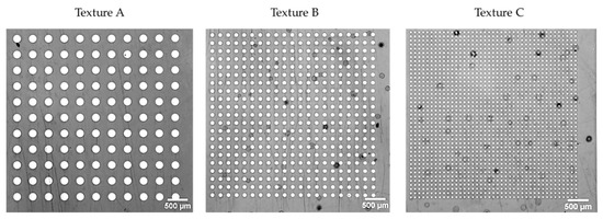 A nickel insert was textured at the microscale and the nanoscale by electroforming (processed by electrochemical deposition) over a silicon wafer, giving three textures like a network of micro-holes with various dimensions, as presented in Table 1.