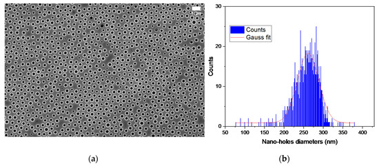 A hierarchical texture is brought by the nano-holes with the aim of changing the wetting behaviour [14]. Those nano-holes are represented in Figure 2a. The diameters of the nano-holes were obtained by image analysis, using the software Image J; the spacing between them was calculated with the plugin Graph. The diameter distribution is represented in Figure 2b, assuming a Gaussian distribution, and the average spacing is estimated at around 278 ± 26 nm.