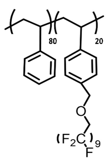 The additive POISE-a was synthetized at a laboratory using a multistep synthesis method consisting of partial and controlled fluorination of a polystyrene backbone [15,16]. The additive used in this study is a random copolymer with a 20% molar (corresponding to 34% in weight of fluorine) of functionalized polystyrene and is named POISE-a-20 (see Figure 3).