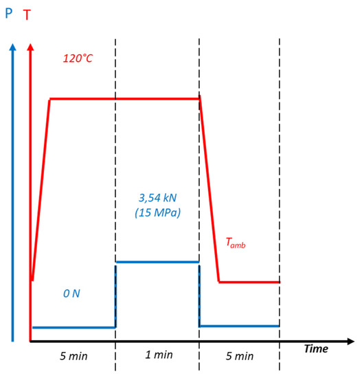The textures were replicated using a laboratory press (Carver®), equipped with the Specac Atlas Series heated platens and the Specac Atlas constant thickness film marker accessory to control the thickness of the polymer samples, corresponding to discs of diameter 55 mm. These processing conditions were defined according to a previous work published by Dubelley et al. [17]. In order to reduce the adhesion between the polymer film and the heating plate during demoulding, a layer of Kapton was inserted at their interface. The replication tests were conducted at 120 °C (i.e., 15 °C above the polystyrene Tg) and under a static load of 15 MPa, corresponding to a compression strain of 68% (see Figure 4).