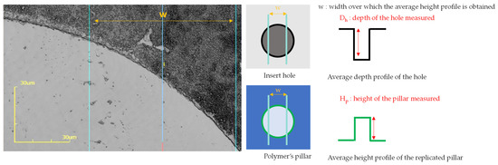 The height measurement was performed on three different pillars for each structure on the polymer films. The micro-hole depths on the nickel insert were characterized with the same method. The replication rate was calculated by the following Equation (1):
