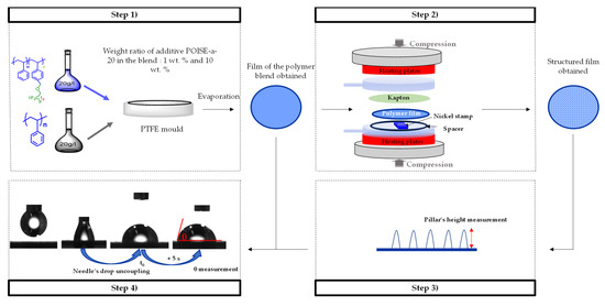Scheme of the different stages: (Step 1) Formulation of polymer blend’s film by solvent casting; (Step 2) Replication of textures A, B, C by hot embossing; (Step 3) Quantification of replication’s quality by laser confocal microscopy; (Step 4) Characterization of hydrophobicity by wettability measurements.