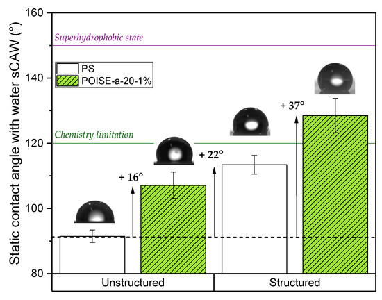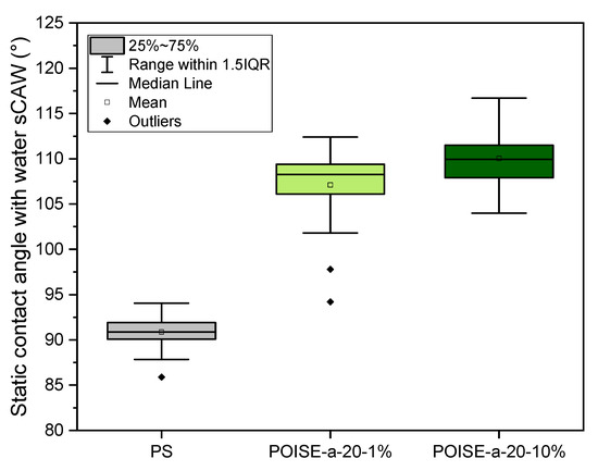 The contact angles increase with the additive content as 1 wt.% of POISE-a-20 increases the sCAW by 16°, rising from 92° for the PS to 108° for the POISE-a-20-1%. When the additive content increases by a factor 10, a slight increase is observed as the sCAW becomes close to 111° for the POISE-a-20-10%. POISE-a-20-1% and POISE-a-20-10% correspond to the fluorine contents in the blend of 0.34 wt.% and 3.4 wt.%, respectively. This suggests that the hydrophobic enhancement with the fluorination rate seems to reach a limit. Indeed, the maximum contact angle reachable for the lowest surface energy polymer is 120° and obtained for a smooth fluorinated surface consisting of hexagonally packed -CF3 groups [18]. In order to reach higher contact angles and increase the hydrophobic character of the polymer surfaces, the surface could be modified with micro/nano-structures [19,20].