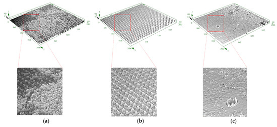 Qualitatively, all the micro-textures can be replicated over the polymer surface with the chosen processing conditions. Nevertheless, depending on the polymer/additive content, one can see that the structure’s homogeneity changes. Indeed, Figure 8a shows the confocal microscopy image of the structure C of PS, where the replication is heterogeneous. Figure 8b shows a homogeneous replication for the POISE-a-20-1% blend. In Figure 8c, some defects can be observed sporadically for the POISE-a-20-10% blend, presenting a morphology with defects. X-ray diffraction measurements would be required at this stage of the study to check whether a phase separation occurs within the blend induced by the crystallization of the fluorinated side chain of the additive, in order to explain the origin of these defects.