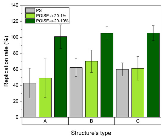 The replication rates were then evaluated for the three textures (A, B, and C) for PS, POISE-a-20-1%, and POISE-a-20-10%. It can be seen in Figure 9 that the replication rates depend on the amount of fluorine additives. These results show that for the neat PS and the replication conditions used, a complete replication is not possible with the maximum replication rate not exceeding 60%. The addition of 1 wt.% of POISE-a-20 in a polystyrene matrix does not seem to have a significant effect on the replication rate, regardless of the texture considered. This result would tend to show that the additive content (1 wt.%) is not sufficient to change the polymer blend rheology and favour the filling of the insert holes. Increasing the additive content to 10 wt.% clearly improves the replication rate, which means that the copolymer changes the overall blend rheological behaviour and also changes the interactions at the polymer/insert interface. The replication rate tends to 100% or slightly exceeds it, due to possible demoulding effects or measurement uncertainties.