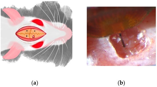 All surgical procedures, handling, and housing were approved by The University of Texas at Dallas Institutional Animal Care and Use Committee. Surgical procedures were performed as per previously established protocols [10,11,18]. Briefly, 9 Sprague-Dawley rats (6 males, 3 females; ~250 g) (Charles River Laboratories, Inc., Houston, TX, USA) were used. Animals were anesthetized with isoflurane (1.8–2.2%) (Covetrus North America, Dublin, OH, USA) supplemented with O2 and the head was shaved to expose the scalp. Toe pinches were used to confirm a deep anesthetized state and the rat was placed in a stereotactic frame (David Kopf Instruments, Tujunga, CA, USA). A far-infrared warming pad (Kent Scientific Corporation, Torrington, CT, USA) was placed below the animal to maintain the body temperature throughout the surgical procedure. Ophthalmic ointment (Lubrifresh P.M., Medline Industries, Wilmer, TX, USA) was applied to the eyes. After cleaning the scalp with alternating Betadine (Avrio Health L.P., Stamford, CT, USA) and alcohol swabs, marcaine (Hospira, Lake Forest, IL, USA) was injected under the scalp and an incision was made down the midline of the skull. Three stainless steel bone screws (Stoelting Co., Wood Dale, IL, USA) were inserted in the quadrants defined by bregma and the coronal and sagittal sutures to act as anchoring screws for the probe, as depicted in Figure 1a. As shown in Figure 1b, a 1 mm × 1 mm craniotomy was performed over the motor cortex (~2 mm from bregma and ~2 mm from central suture line) and dura mater was resected. A 16-channel, 3-mm-long probe (A1x16-3 mm-100-177-CM16LP, iridium electrode sites) (NeuroNexus Technologies, Ann Arbor, MI, USA) was implanted to a depth of 2 mm at a speed of 1 mm/s using a precision-controlled neural implantation device (NeuralGlider, Actuated Medical, Inc., Ann Arbor, MI, USA). Ground and reference wires from the neural probe were connected to two of the anchor screws. Collagen-based dural graft (Biodesign Dural Graft, Cook Medical, Bloomington, IN, USA) was placed in the craniotomy to cover the exposed cortical site. This was followed by a layer of GLUture (World Precision Instruments, Sarasota, FL, USA) to seal the craniotomy site. Once the GLUture cured, dental cement (Stoelting Co.) was used to form a head-cap that secured the probe to the anchoring screws and encapsulated the ground and reference wires of the probe. Surgical staples were utilized to close the midline incision and rats were administered 0.15 mL/kg of buprenorphine (ZooPharm, LLC., Laramie, WY, USA) and 0.05 mL/kg of cefazolin (Med-Vet International, Mettawa, IL, USA), and the antibiotic sulfamethoxazole and trimethoprin oral suspension (200 mg/40 mg/5 mL, Aurobindo Pharma, Dayton, NJ, USA) was added to the drinking water (1 mL/100mL drinking water) for a week post-surgery. After 72 h of surgery, animals received an additional dose of buprenorphine.