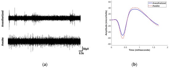 Neurophysiological data acquisition. (a) Exemplary single-unit recordings of an animal in anesthetized and awake state, respectively, are shown here. (b) Representative mean waveform of a unit under anesthesia and when awake.