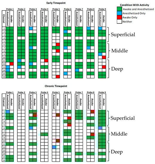 Effect of isoflurane anesthesia on AEY. Schematic depicting activity under anesthetized and awake conditions arranged by depth for early and chronic time points. The condition under which activity was observed is color-coded. Probe 2 was excluded from analysis at the chronic time point because units could not be reliably observed on the device by week 10.