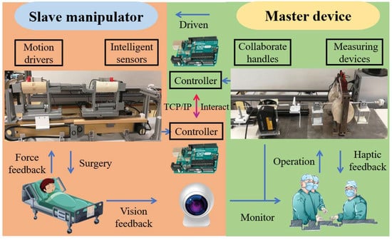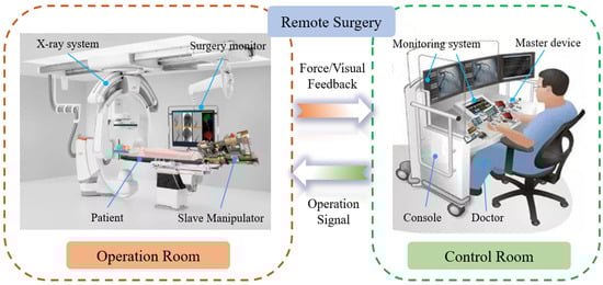 Robot-assisted endovascular catheterization (EC) systems are attracting growing interest and attention due to the obvious drawbacks of traditional vascular interventional surgery (VIS), including prolonged X-ray radiation, high-intensity surgical stress and unmonitored surgical risks []. In the field of robot-assisted VIS, the core components are surgeons, patients, and robot operating systems [,]. As shown in Figure 1, endovascular interventional doctors could be liberated from the operating room in X-ray radiation, and their long-term workload reduced. Surgeons operate a master device to control and monitor the overall process of interventional surgery in a separate control room without radiation. Correspondingly, the patient and slave manipulator are located in operating room for the performance of EC surgeries including insertion, extraction, and rotation. Robot-assisted surgeries also play a critical role in increasing the treatment comfort of patients and improving surgical precision. Furthermore, the design of master–slave makes it possible to develop the technology of telesurgery and specialist treatment during the process of VIS, which is of great significance for medical treatment in remote areas [].