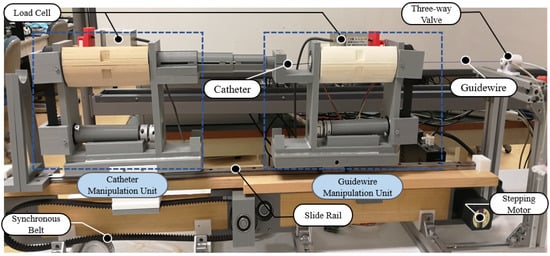 The surgical instruments, such as the catheter and guidewire, are inserted into the blood vessels of patients by a slave manipulator-robot, which is placed in the operating room. This slave manipulator was designed by our research team in a previous study [], and is shown in Figure 3. This slave side has the ability to collaboratively operate the guidewire and catheter simultaneously, thanks to the designs of the catheter manipulation unit (CMU) and guidewire manipulation unit (GMU). The insertion motion and extraction motion of CMU and GMU are achieved using a stepping motor (ASM46AA, ORIENTAL MOTOR, Japan) with a resolution of 0.36 degrees. Meanwhile, two torque sensors are used to collect several radial torque signals of the catheter and guidewire. It should be noted that a novel grasp device based on two micro-stepping motors (LIKO MOTOR, 20BYGH30-0604A) was adopted on the slave side. In addition, the proximal force of the moving instrument is measured by two load-cells (TU-UJ, TEAC, Japan) with a detection range from −5 N to 5 N, and the force value is exhibited in the control console. The maximum effective moving range of CMU and GMU is 40 cm, and the overall length of this slave manipulator-robot is 92 cm. This slave manipulator-robot can insert/extract a surgical guidewire and catheter with high precision and effectively detect force when conducting an endovascular catheterization surgery.
