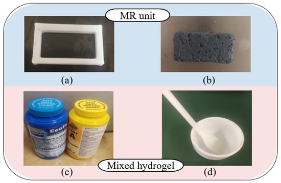 - Component preparation: Earlier research by our team adopted MR fluid to generate haptic force feedback [,]. This kind of smart material displays good controllability under a magnetic field. Since it is a substance in which oil and liquid are layered, we selectively use the liquid part for this study. Then, a firming agent is added to improve the plasticity of the MR material. After forming in a rectangular mold, a solid MR unit is obtained with a specific shape. In addition, the hydrogel rubber (EcoflexTM, 00-20, Macungie, PA, USA) includes mixture A and mixture B, which need to wait for their pot-life of 30 min. The mixed liquid should also be prepared before the molding process. Figure 5 shows some related components.