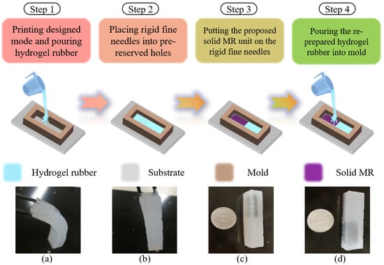 - Molding process: After the process of preparation, four steps are proposed to build the magnetically controlled hydrogel (MCH), which will be employed to offer haptic feedback. The detailed molding process and generated samples are shown in Figure 6.
