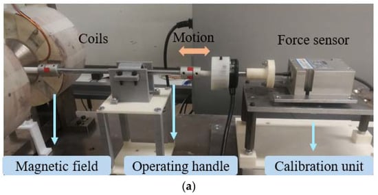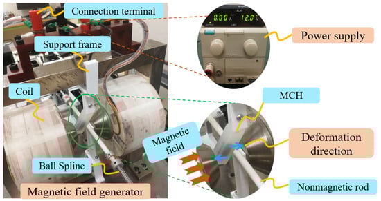 The underlying principle of “haptic device” is frictional resistance generated by contact between the MCH and a nonmagnetic rigid rod. As shown in Figure 7, the upper and lower parts of the MCH, placed at an inclined angle, incur relative deformations that will result in direct contact between the MCH and the nonmagnetic rod. With the change in magnetic field density, the MCH can undergo various degrees of deformation to provide different force feedback sensations to the operator’s hand. In other words, we use the current to control the magnetic field density, and adopt a magnetic field to control the force feedback sensation generated by the MCH.
