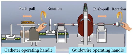Collaborative operating is vital for surgeons when conducting interventional surgeries. In this study, the coaxial design of the handles and the separate structure of the catheter handle and the guidewire handle enable collaborative operations to be performed in accordance with the surgeon’s natural surgical method. The collaborative operation mechanism is exhibited in Figure 9. Both the COH and GOH have a translation motion (push–pull) and a rotation motion. By selectively manipulating the COH and GOH, the status of the translation or rotation can be determines, and individual movement, individual rotation, synchronized movement, and synchronized rotation can be accomplished in operations.