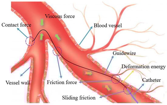 Force detection on the slave side is an important issue, and can capture real-time force information during surgery. This detected force can also be used for haptic feedback of the master side. Two load-cells mounted on the slave manipulator-robot detect the proximal force in the developed ECRS. As shown in Figure 10, five force components make up the complete proximal force: viscous force, contact force, sliding friction, friction force, and potential deformation energy. The viscous force is the natural viscous resistance from blood, which is inevitable. The contact force is a collision force between the tip of guidewire and the blood vessel wall. Unlike the instantaneity of the contact force, the friction force is a combined force with lots of curved contact points that occur over the whole surgical instrument. Sliding friction is also a kind of friction force, and defines the interaction force between the inner wall of catheter and the outer wall of guidewire. Finally, the vital potential deformation energy mentioned in this section is caused by the irregular deformation of an elastic object, such as a surgical instrument. Therefore, the force detection model can be described as Equation (1).