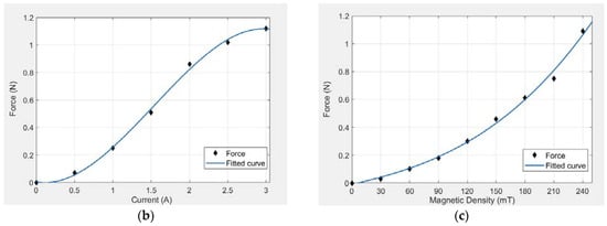 In order to build the mathematical model between haptic force and the magnetic field, the experimental set-up was calibrated. The results for experiment I are displayed in Figure 11. We adopted a calibration unit based on a force sensor (Load Cell, Japan) to detect force information when powering the magnetic field. The operating handle was directly connected to calibration unit, and they were coaxial. At the beginning, we regulated the power supply to generate magnetic fields through the coils. Then, we slowly increased the thrust of the operating handle until relative sliding for the handle and force feedback structure occurred. Meanwhile, the calibration unit was able to capture the hitting force signal. In addition, we used two experimental methods to finish the calibration. The first one was to vary the supplied current strength to control the magnetic field within a fixed step of 0.5 A (the full range of the power supply is 3 A). The second method was to adjust the magnetic density from 0 mT to 240 mT at a fixed variation value of 30 mT. The value of the magnetic density was measured using a Tesla Meter (KANETEC, Japan). Note that a magnetic field density with a strong value was only used to calibrate the fitted relationship between the magnetic field and force in this part. A magnetic field over 200 mT is really not safe or stable. Generally, a secure laboratory magnetic environment is 100 mT to 130 mT. After fitting the experimental points using the cftool toolbox in MATLAB, it was possible to obtain two fitting third-order polynomials, which are shown as Equations (2) and (3).
