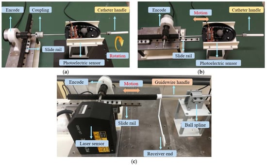 We organized three kinds of evaluation experiments to test the measurement accuracy of the proposed master operating device. The details of the experimental setup for translation and rotation are shown in Figure 12. The first two experiments were used to verify the detection accuracy of the photoelectric sensor (PS), which were mounted on the catheter operating handle. The purpose of third experiment was to evaluate the linear performance of the laser sensor (KEYENCE, Japan; the accuracy is 50 μm/mV), which was installed on the guidewire operating handle. During these three accuracy evaluation experiments, a sliding mechanical structured platform based on a rotating encode (MTL, MES020-2000P, Japan, the accuracy is 0.09 degrees/pulse) and slide rail (25 cm, Japan) was applied, to validate the measurement accuracy for both the operating handles.