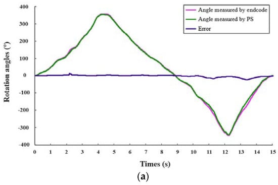 In the rotation performance evaluation experiment (a), we used a rigid coupling to connect the catheter handle and the rotary axis of the sliding platform, to ensure absolute coaxial rotational motion. According to doctors’ natural surgical actions, the catheter operating handle was rotated using both counterclockwise and clockwise operations at a relatively gentle speed to reduce operation errors. We obtained the rotation accuracy by comparing the measured rotation angles of the encoder and the PS.