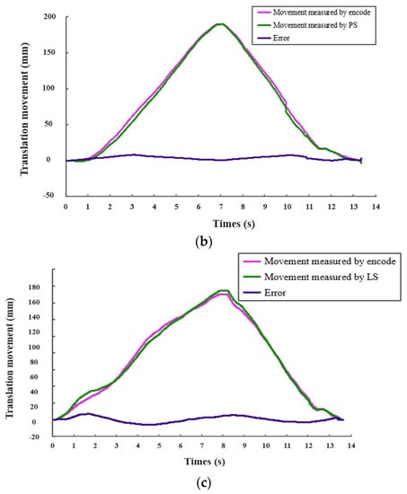 The accuracy result for experiment (c) highlights a lot of trembling moving data points. This is because the designed receiver end is a 3D-printed PLA suspended structure instead of a rigid material. During the process of translation movement, the receiver end incurred a small range of front-to-back shaking. The pink line is the movement measured by the encoder; the green line is the movement measured by the LS; and the purple line is the error. After calculating the results in experiment (c), the minimum error is less than 0.2 mm, and the average translation error is 3.24 mm.