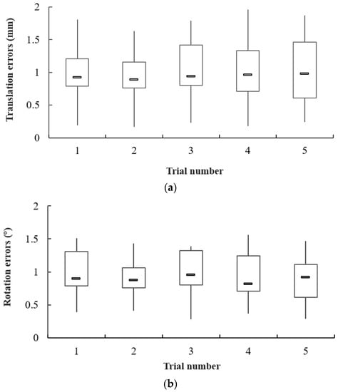 The experimental results for tracking performance are shown in Figure 14. These data were collected by translation and rotation, respectively. From the box diagrams in Figure 14a, the average error of translation is 0.94 mm, the maximum error of translation is 1.96 mm, and the minimum error of translation is 0.17 mm. From the statistical result of rotation errors in Figure 14b, the average error of rotation is 0.89 degrees, the maximum error of rotation is 1.56 degrees, and the minimum error of rotation is less than 0.3 degrees. Based on the analysis of statistical tracking results, it is firmly believed that this developed ECRS is satisfactory for robot-assisted surgery.