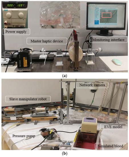 To further verify the actual surgical performance of this developed ECRS, a trans-parent endovascular evaluator (EVE, Fain-Biomedical, Nagoya, Japan) human model was adopted in this experimental part. A pressure pump (KB-4N, Tokyo, Japan) was used to continuously inject simulated blood into the EVE human model, which is a very realistic surgical operating environment. In addition, we utilized a monitoring interface located on the slave side and displayed on the master side, to monitor the surgical status for insertion and extraction in real time. The details of the in vitro experimental setup are shown in Figure 15. Figure 15a is the designed master haptic operating side including two operating handles, a novel haptic feedback structure, a monitor interface, and a power supply. The slave manipulation side consisted of a slave manipulator-robot, an EVE human model, a press pump, and a network camera (VIV-TEK, San Jose, CA, USA). The camera had the ability to monitor the surgical status during the operating stage of experiment. Then, a real-time video was shown on the master side to guide the surgeries. Meanwhile, the operators could adjust the view of camera online at any time to ensure an excellent operational perspective. Regarding the introduction of surgical instruments, a J-type guidewire with a length of 260 cm and a catheter (Saitama, Japan) with a diameter of 5Fr (1Fr = 0.333mm) were used in this experiment.