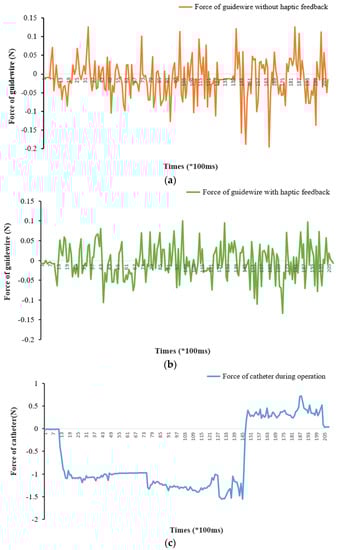 Experimental results for in vitro experiments: (a) the measured force of the guidewire without haptic feedback; (b) the measured force of the guidewire with haptic feedback; (c) the measured force of the catheter during the operation.