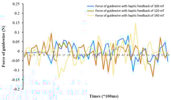 From the experiment results in Figure 16, it is very clear that force information measurements differ between operation with haptic feedback and without haptic feedback. The maximum force value is 0.195 N and the minimum force value is 0.0002 N in the experiment for the guidewire without haptic feedback (see Figure 16a). The maximum force value is 0.134 N and the minimum force value is 0.0007 N in the experiment for the guidewire with haptic feedback (see Figure 16b). Finally, the maximum force value is 0.195 N and the minimum force value is 1.553 N in the experiment for the catheter during the operation (see Figure 16c). Therefore, the study of haptic force feedback is vital for robot-assisted surgery, and can directly affect the force generated in the patient during surgery. Furthermore, we conducted three groups of guidewire force experiments with different levels of force feedback (100 mT, 120 mT, and 140 mT) to quantify the experimental result of force feedback. The quantitative experimental result with different levels of force feedback is depicted in Figure 17. As shown in the three differently colored data curves, the value of haptic feedback magnetic density can affect the stability and the maximum force value of the guidewire with haptic feedback. According to the literature [], 110 mT is a stable reference magnetic field. The maximum force of the guidewire with a haptic feedback of 100 mT is 0.1067 N; the maximum force value with haptic feedback of 120 mT is 0.1338 N; and the maximum force value with haptic feedback of 140 mT is 0.14801 N. As shown in Figure 17, a force feedback environment of 100 mT and 120 mT is relatively safe and stable. The force information of the guidewire becomes a little bit abrupt when the magnetic density is 140 mT. The occurrence of this result might be due to the difficulty in precisely controlling the magnetic field.