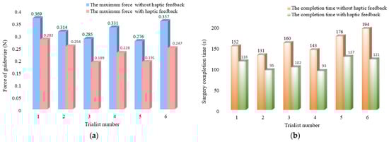 The statistical results for 6 trialists: (a) the maximum force value of guidewire without and with haptic feedback; (b) the surgery completion time for the operation task.