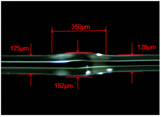 A fusion splicer (Furukawa, S177B, Tokyo, Japan) is used to fabricate the fiber Michelson, and the fiber used for the sensor is a common single-mode fiber with core and cladding diameters of 9 µm and 125 µm, respectively. A fiber cleaver (Furukawa, S325, Tokyo, Japan) is used to cut the fiber end face flat to obtain a reflective end face with high reflectivity. The part between the waist-enlarged bitaper and the reflective end face is the sensing arm. According to the required length of the sensing arm, the position of the waist-enlarged bitaper is selected and the manual welding program is set to make the waist-enlarged fiber bitaper. Through a large number of experimental comparisons, it is found that if the waist size of the waist-enlarged bitaper is too small, the contrast of the generated interference fringes will become smaller; and if the bitaper is too large, the overall intensity of the spectrum will be reduced. Therefore, it is necessary to restrict the size of the waist-enlarged bitaper structure within a certain range, and an intermediate size is selected in the manufacturing process. The parameters in the specific production process are as follows. The discharge cleaning is set to 50 ms, the discharge duration is set to 1100 ms, the discharge intensity is set to 155 xmW and the push distance is set to 140 μm. Due to the high discharge intensity and the large advancing distance, the diameter of the set point will slowly expand. Figure 2 is a 90-times magnified photo of the optical fiber waist-enlarged bitaper under the microscope (Olympus, SZ61, Center Valley, PA, USA). It can be seen from the figure that the diameter of the welding point is enlarged from 125 μm to about 152 μm, and the length of the optical fiber waist-enlarged bitaper is about 350 μm.