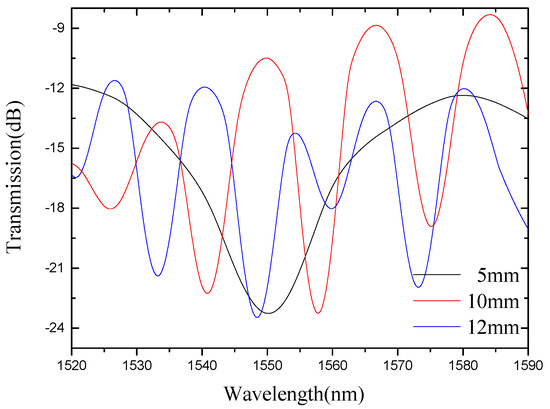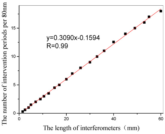 Figure 3 shows the interference fringes corresponding to sensors with different lengths. It can be seen from the figure that the contrast of the interference fringes is high, and the interference peaks and interference valleys are clearly visible. By fabricating a large number of sensors, we summarize the relationship between the interference arm length and the interference period per 80 nm spectral range. It can be seen from Figure 4 that as the length of the interference arm increases, the spectrum in the unit spectral range increases. In other words, as the interference arms grow, the interference fringes become denser.