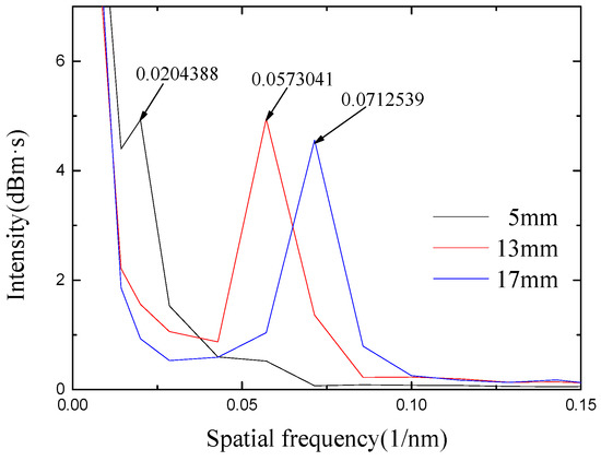 The spectrum is converted to a spatial spectrum by a fast Fourier transform (FFT), as shown in Figure 5. It can be seen that the high-order spectra corresponding to sensors of different lengths have only one main peak. For sensors with interference lengths of 5 mm, 13 mm and 17 mm, the positions of the main peaks are at 0.0204388 nm−1, 0.0573041 nm−1 and 0.0712539 nm−1, respectively. Based on Taylor expansion, the phase can be defined as [24]: